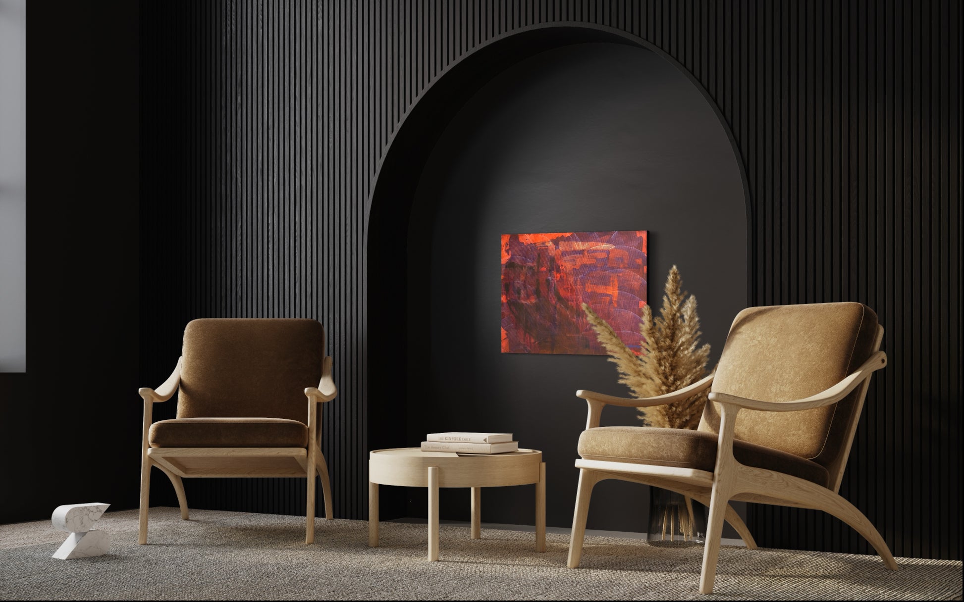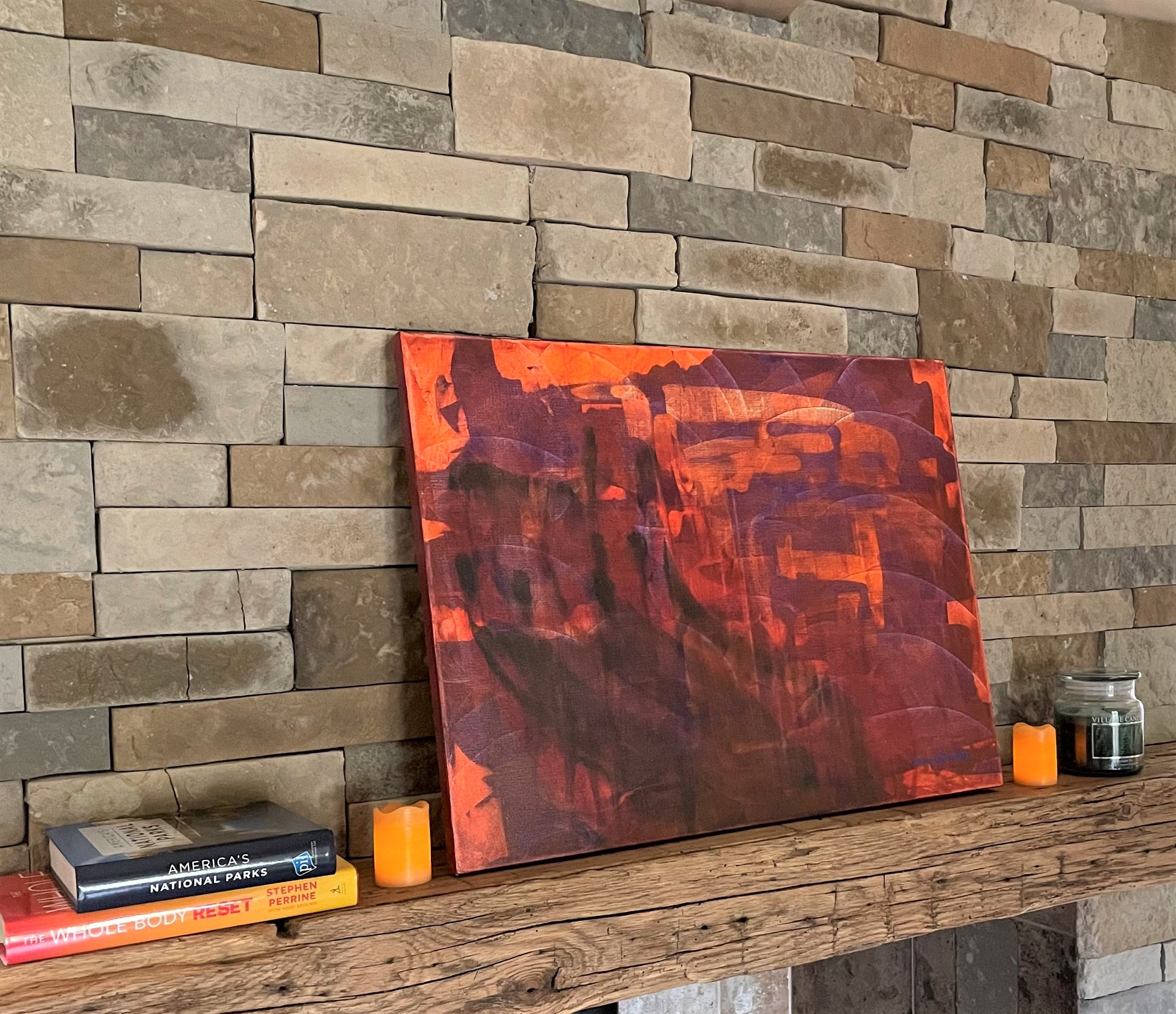 18”x24” Original acrylic on canvas. Deep reds, orange and a hint of blues and purples dance as a distant sun goes down on this alien world. A family of aliens watch as the day ends on this distant land. See the aliens? No? Look again.
