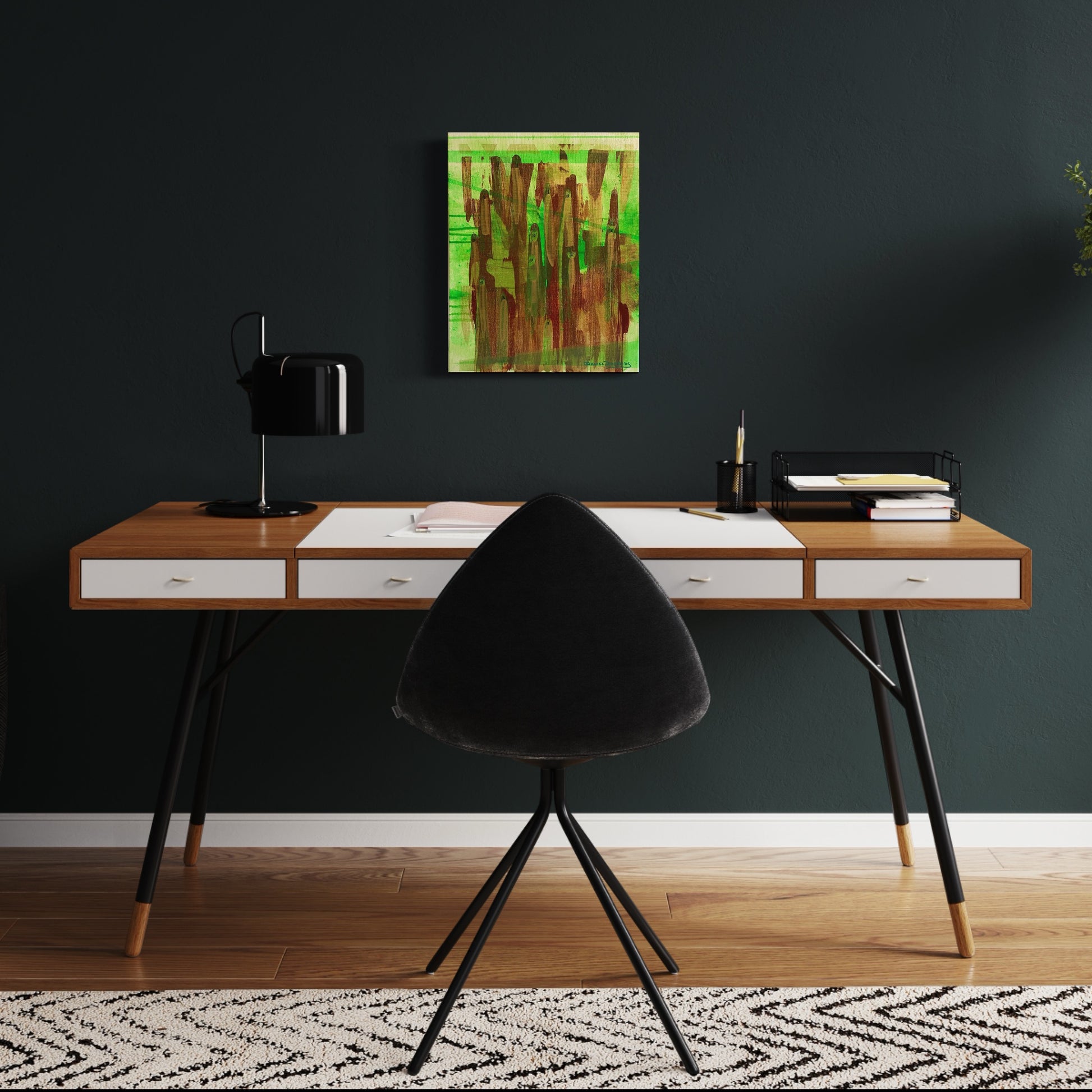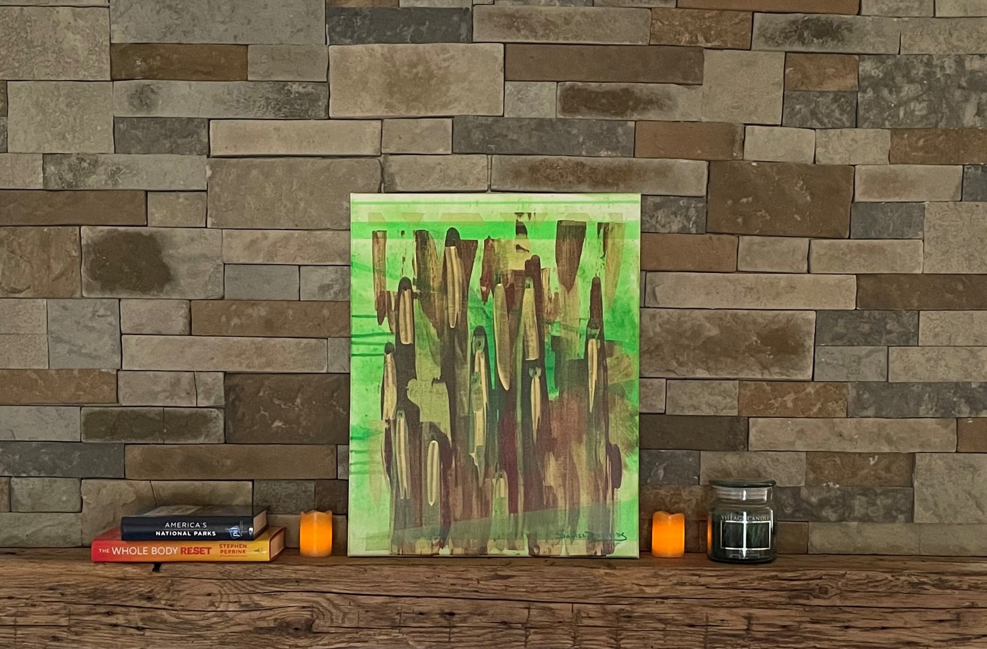 16" x 20" Fluorescent greens, browns & metallic bronze makeup this original acrylic on canvas. The council is converging. What ponderous discussion are they about to have?