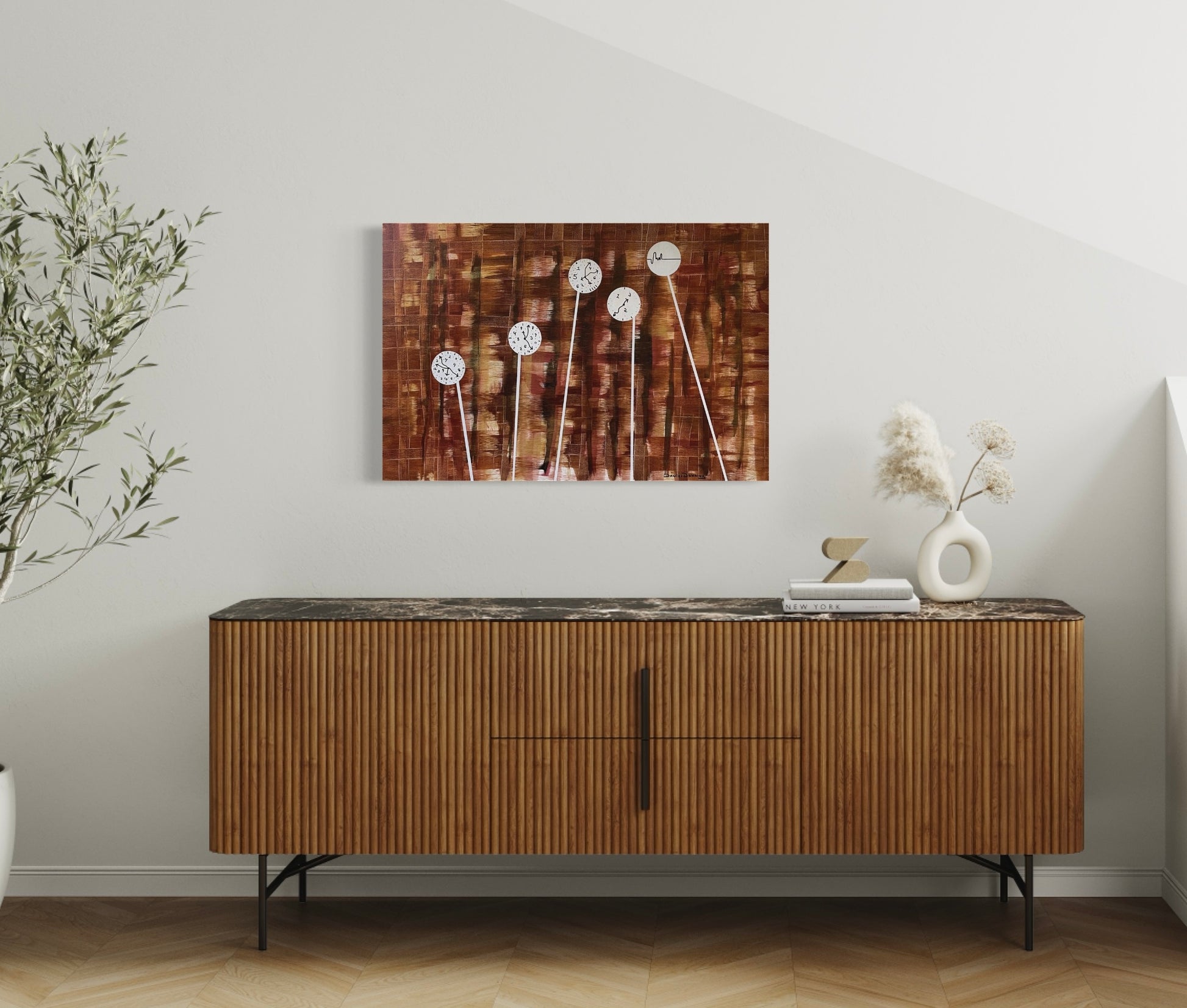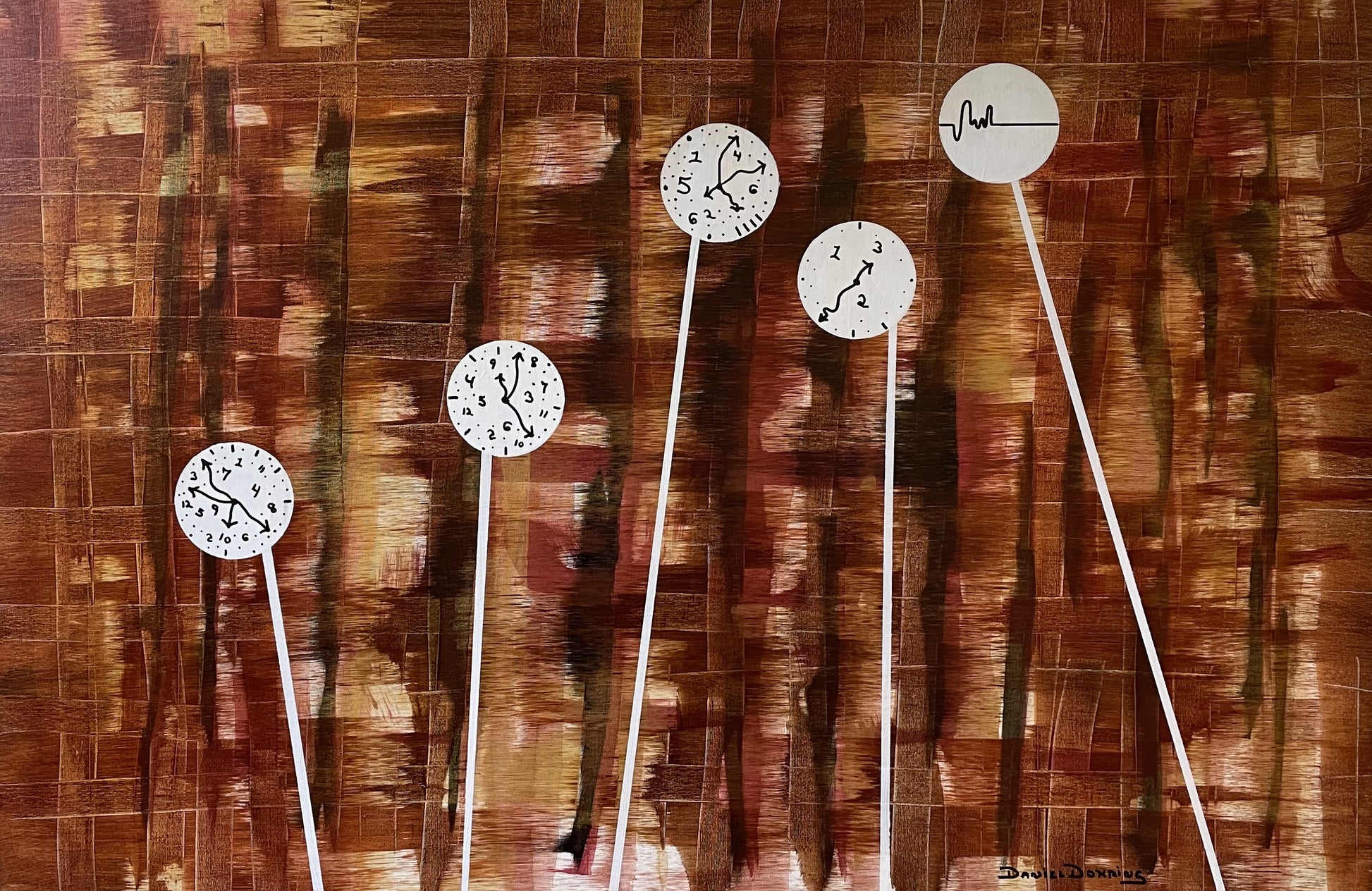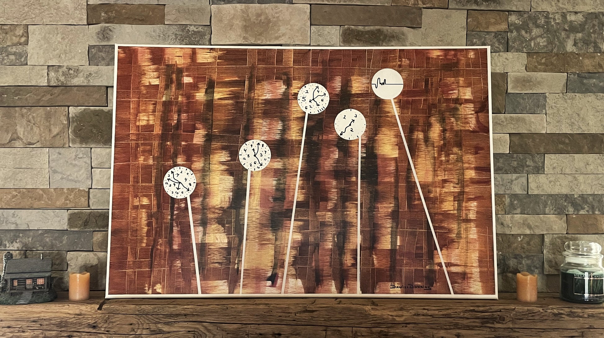 24" x 36" Original acrylic on canvas. What is time? Does time actually pass or is there only ever the present? Albert Einstein stated "The distinction between past, present, and future is only a stubbornly persistent illusion." Theoretical physicist Carlo Rovelli concludes "There is no evidence for time" and that "time does not exist". What if this were true? What if the passing of time is simply a human construct that exists only to help us make sense of what we see and experience.